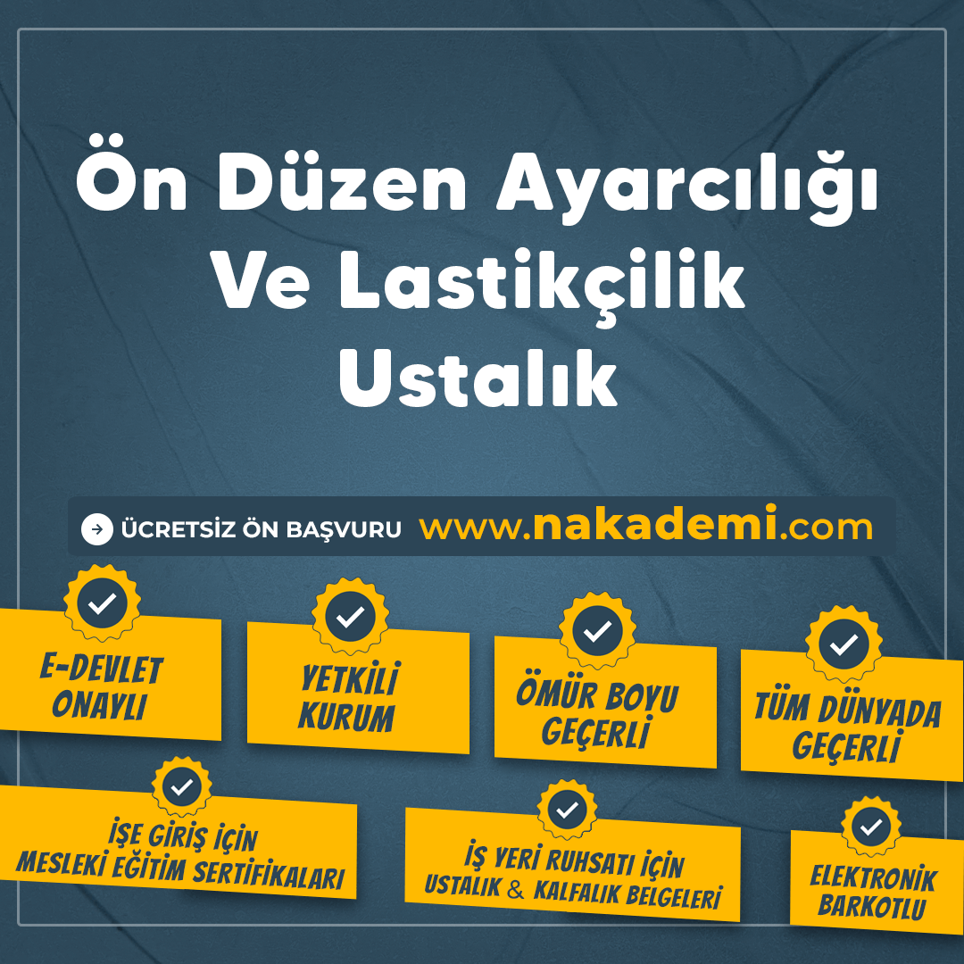 Ön Düzen Ayarcılığı Ve Lastikçilik Ustalık için E-Devlet onaylı, Ömür Boyu Tüm Dünyada Geçerli İşe Giriş İçin Mesleki Eğitim Sertifikası ya da İş Yeri Ruhsatı için Ustalık Kalfalık Belgesi alabilirsiniz. Ön Düzen Ayarcılığı Ve Lastikçilik Ustalık için ücretsiz ön başvuru ve meslek uzmanı tarafından ücretsiz destek fırsatını kaçırmayın.
