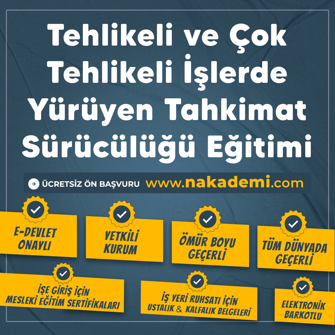 TEHLİKELİ VE ÇOK TEHLİKELİ İŞLERDE YÜRÜYEN TAHKİMAT SÜRÜCÜLÜĞÜ EĞİTİMİ için E-Devlet onaylı, Ömür Boyu Tüm Dünyada Geçerli İşe Giriş İçin Mesleki Eğitim Sertifikası ya da İş Yeri Ruhsatı için Ustalık Kalfalık Belgesi alabilirsiniz. TEHLİKELİ VE ÇOK TEHLİKELİ İŞLERDE YÜRÜYEN TAHKİMAT SÜRÜCÜLÜĞÜ EĞİTİMİ için ücretsiz ön başvuru ve meslek uzmanı tarafından ücretsiz destek fırsatını kaçırmayın.